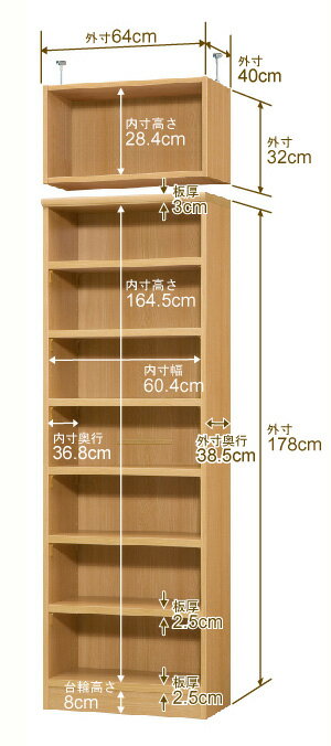 天井つっぱり上置棚サイズ奥行38.1cm×高さ32cm×幅64cm材 質本体・プリント紙化粧繊維板突っ張り金具・スチール塗 装ウレタン樹脂塗装本体:オーダーマルチラックサイズ奥行40cm×高さ178cm×幅64cm材 質プリント紙化粧繊維板塗 装ウレタン樹脂塗装棚 板棚 板耐荷重1枚25kg(目安)棚 板奥行36.8cm奥行40cm×高さ217〜226cm×幅64cm