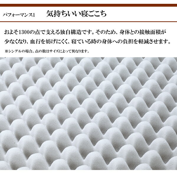 6つのパフォーマンス 1.気持ちいい寝心地 およそ1300の点で支える独自構造です。
