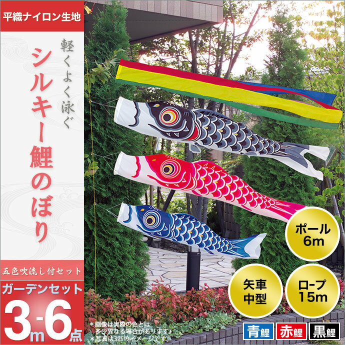 【b_2sp0309】【2019年新作鯉のぼり】庭園用 庭用 セット各種(矢車・ポール付) (五色吹流し)「シルキー鯉・ガーデンセット3m6点セット」(ガーデン用・平織ナイロン生地使用)大空を華麗に舞う鯉のぼりの由来は、中国の黄河上流に竜門と呼ばれる激流が連なった難所があり、竜門を登りきった鯉は竜と化し、天に昇ったという、古代中国の伝説にあやかったもので、男子出生の祝いとして、願いを込めて空高く揚げたのが始まりとされています。