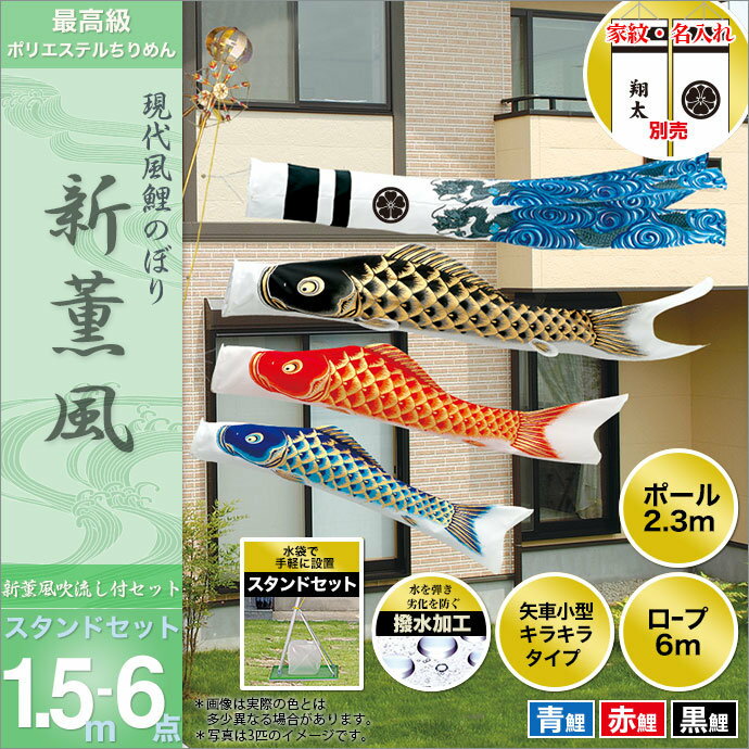 【2019年新作鯉のぼり】ベランダ用 こいのぼり 家紋・名前入可能 セット各種(矢車・ロープ・ポール付き)「新薫風鯉スタンドセット1.5m6点セット」(水袋)(ちりめん風ポリエステル生地使用・撥水加工済み)大空を華麗に舞う鯉のぼりのいわれは、中国の黄河上流に竜門と呼ばれる激流が連なった難所があり、竜門を登りきった鯉は竜と化し、天に昇ったという伝説にあやかったもので、男子出生の祝いとして、“出世”の願いを込めて空高く揚げたのが始まりとされています。